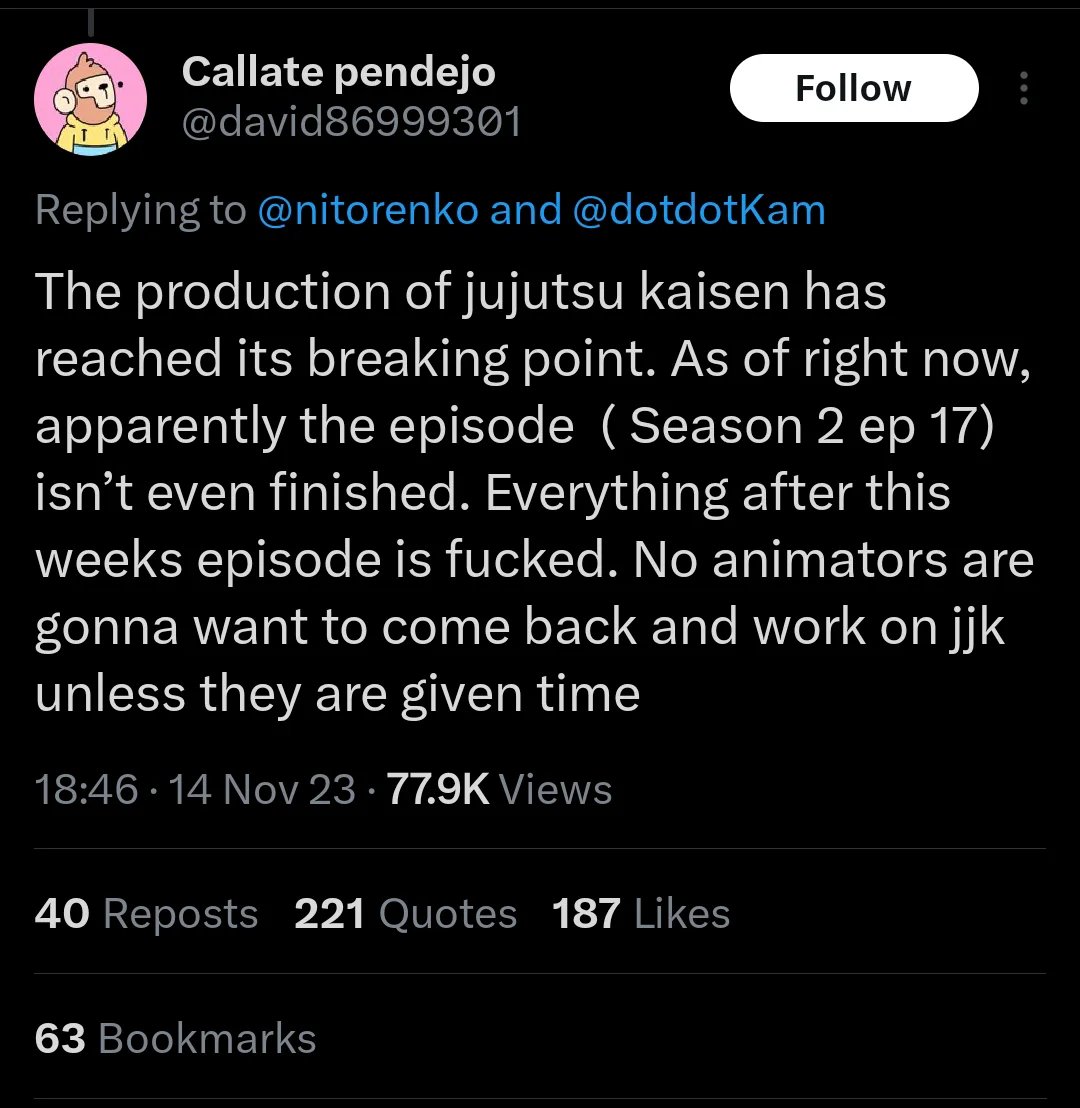 Al parecer el estudio Mappa, responsable del anime de Jujutsu kaisen, ha forzado tanto a sus empleados en la producción de la serie que ahora mismo su futuro está en el aire. Según parece, el capítulo 17 (el siguiente que debería emitirse) ni siquiera está terminado de animar y muchos de los animadores han decidido plantarse y no continuar debido a las duras condiciones laborales y a la carga de trabajo.
