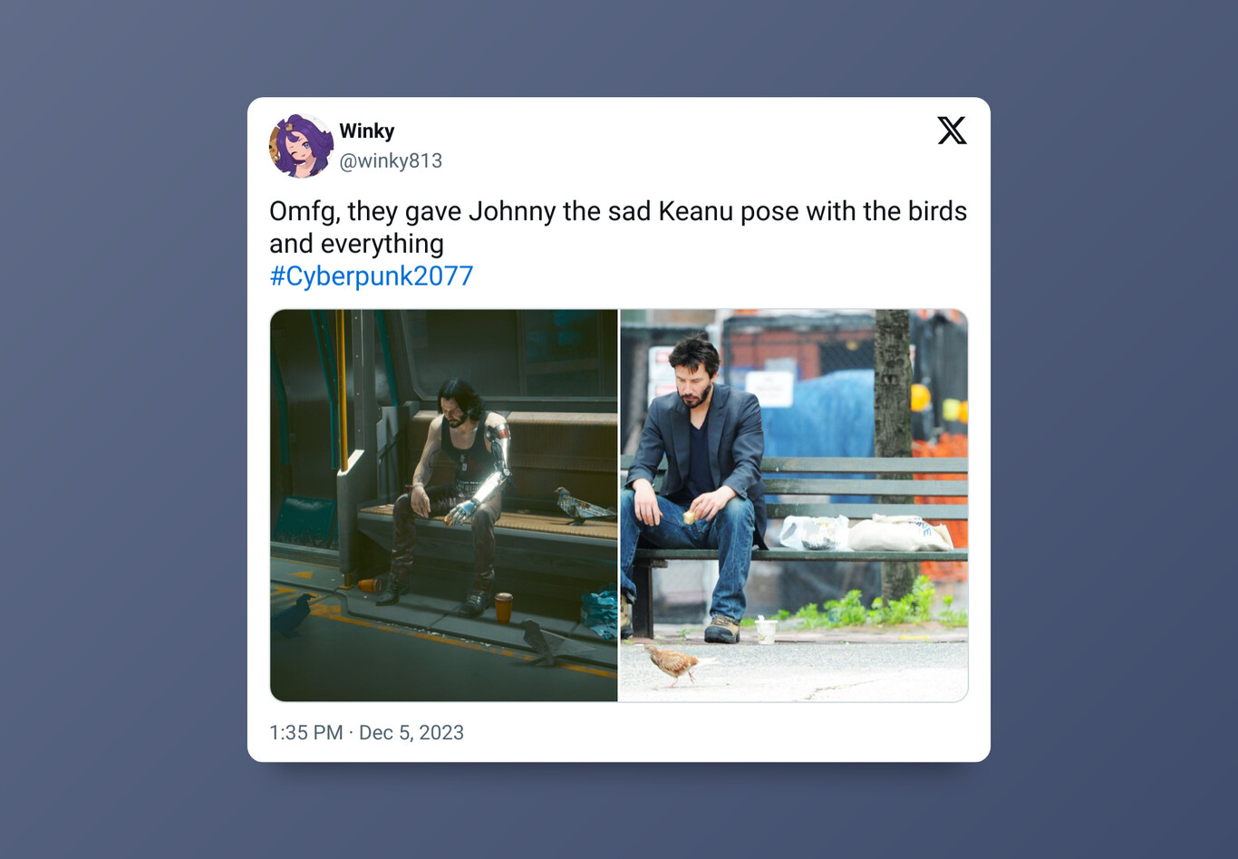 Este último punto es clave, ya que aunque muchos usuarios han podido utilizar el metro en la versión de PC gracias a un mod, ahora tenemos un sistema de transporte completamente funcional. Allí podemos ver al personaje de Reeves, Johnny Silverhand, adoptando la misma pose cansada y triste que la imagen original del actor, capturado en la calle mientras come un sándwich solo.