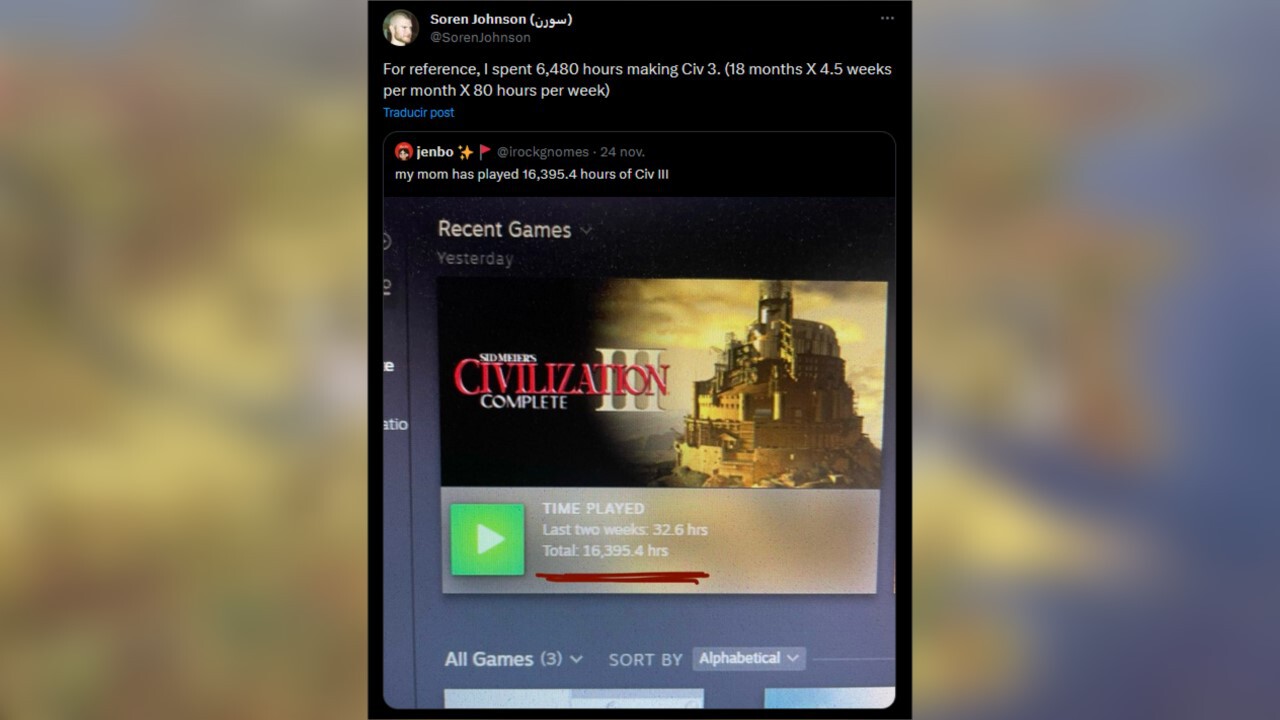 Incluso el que fuera uno de los diseñadores principales de la saga ha alucinado al conocer la historia. Un usuario con el nick "Jenbo" publicaba en redes sociales una captura de pantalla con un mensaje muy simple: "Mi madre ha jugado 16.395,4 horas a Civilization 3". Estamos hablando de las horas equivalentes a casi dos años completos (1,87 para ser exactos). Para hacerlo algo más impresionante, está cerca de haber dedicado tres veces más tiempo al título del que tardó en desarrollarse aquella entrega de la saga de Sid Meier. Así lo confirmaba uno de los antiguos desarrolladores de Firaxis, quien se sentía feliz y sorprendido al descubrir la situación.