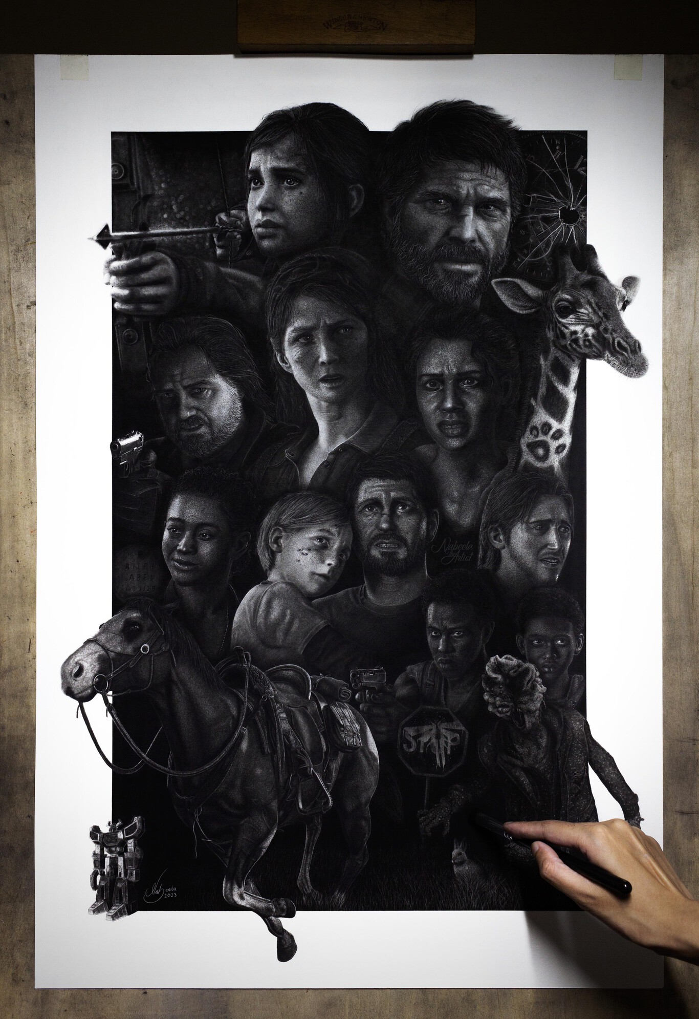 El retrato que veréis a continuación lo ha hecho Nabelaa The Artist, que ha compartido su progreso por redes sociales. El artista ha destinado 300 horas de su vida en dibujar un cuadro sobre The Last of Us: Parte 1, con dibujos de sus protagonistas y personajes. De hecho, esta creación está llena de detalles interesantes, como el reloj roto de Joel, el conejo que caza Ellie, la famosísima jirafa que aparece en el tramo final del título, el caballo y hasta el juguete de Sam.