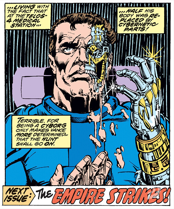 La verdad es que la similitud entre el personaje de Beilert Valance, introducido en el cómic número 16 de la serie regular de Star Wars editada por Marvel en 1978, y el icónico Terminator de la película que James Cameron estrenaría en 1984, es innegable. Valance, presentado como un cazarrecompensas implacable que más tarde se revela como un cyborg. Los diseños realizados por Walter Simoonson para este cómic resultan sorprendentemente similares al aspecto que más tarde tendría Arnold Schwarzenegger en la película.