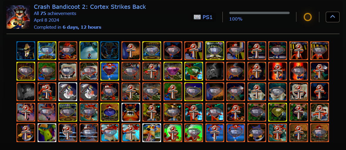 La verdad es que yo nunca he sido de logros pero es una forma muy divertida de incentivar rejugar juegos clásicos, gracias a ello me entraron ganas y completé al 100% Crash Bandicoot 2: