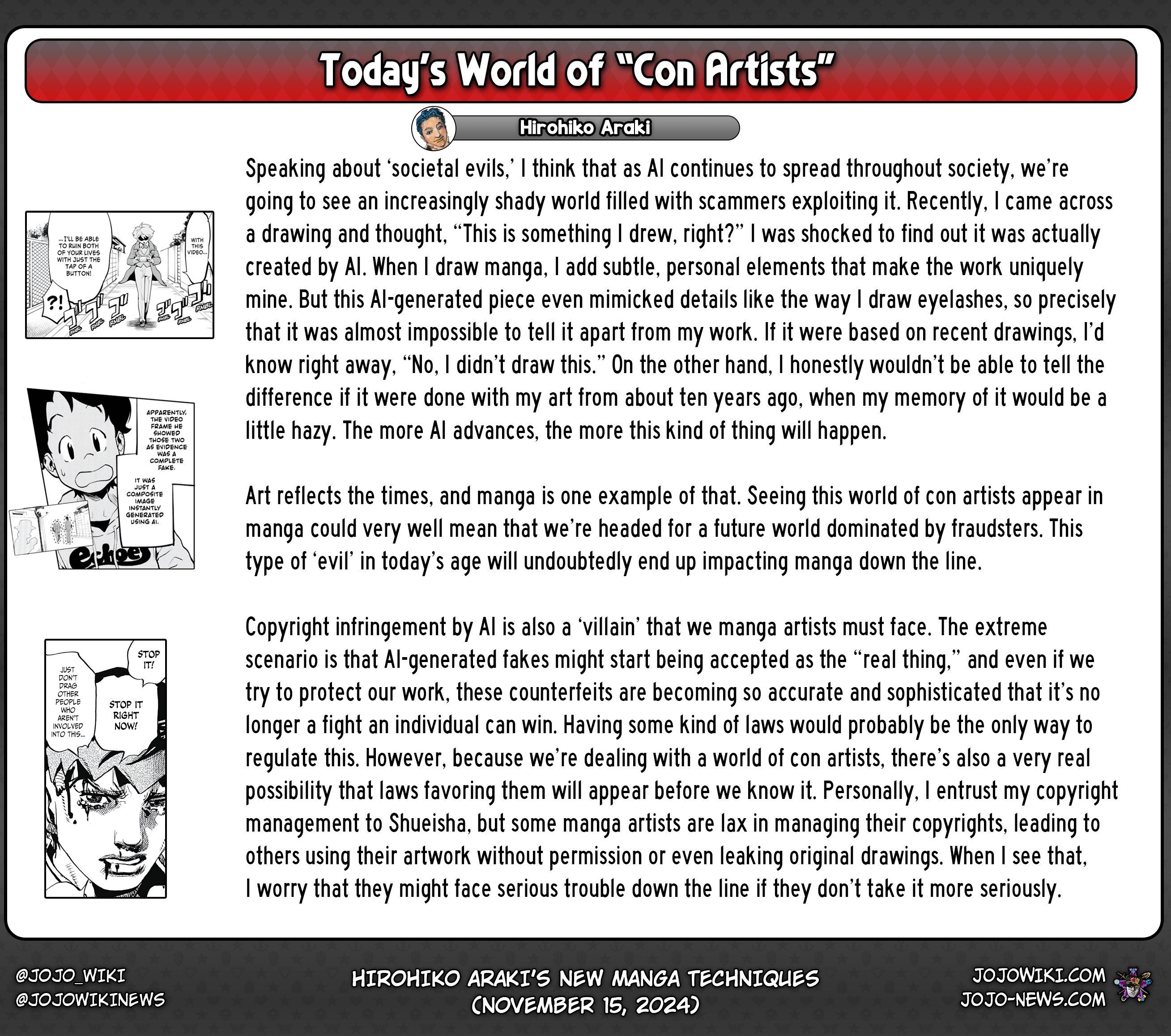 La infracción de derechos de autor por parte de la IA también es un "villano" al que debemos enfrentarnos los artistas de manga. El escenario extremo es que las falsificaciones generadas por IA podrían comenzar a ser aceptadas como "reales". e incluso si intentamos proteger nuestro trabajo, estas falsificaciones se están volviendo tan precisas y sofisticadas que ya no es una lucha que un individuo pueda ganar. Tener algún tipo de ley probablemente sería la única manera de regular esto. Sin embargo, debido a que estamos tratando con un mundo de estafadores, también existe una posibilidad muy real de que aparezcan leyes que los favorezcan antes de que nos demos cuenta. Personalmente, confío la gestión de mis derechos de autor a Shueisha, pero algunos artistas de manga son negligentes a la hora de gestionar sus derechos de autor, lo que lleva a que otros utilicen sus obras de arte sin permiso o incluso filtren dibujos originales. Cuando veo eso, me preocupa que puedan enfrentar serios problemas en el futuro si no lo toman más en serio.