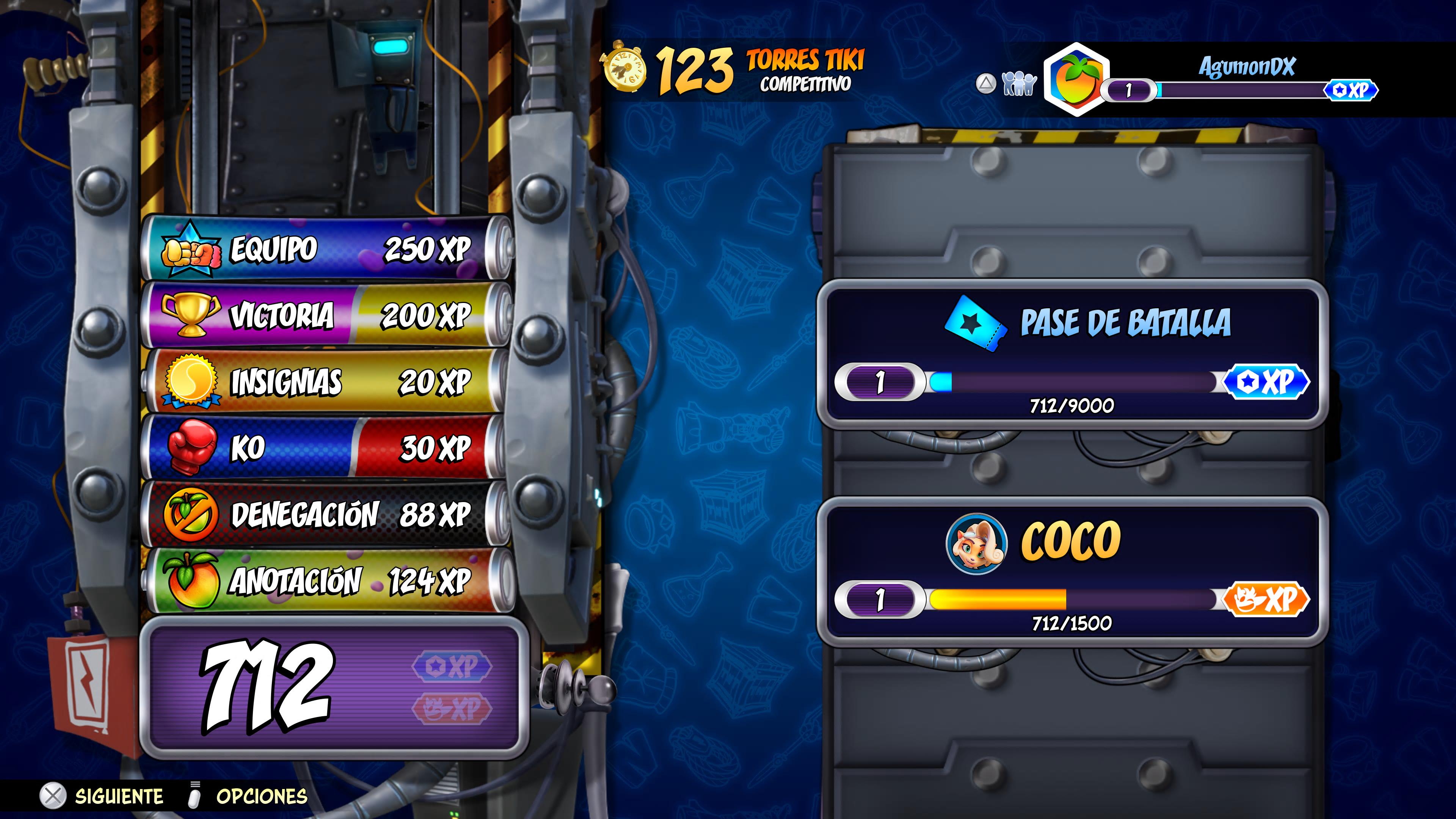 Como podéis ver, distintas acciones en la partida te dan insignias, y esas insignias nos otorgan experiencia, que se suma a dos pases diferentes: el pase de la temporada actual (con 40 recompensas, al menos en la beta) y el pase de personaje (con 6 en la beta). Estos pases tienen únicamente cosméticos en las categorías antes mencionadas. El requisito de experiencia para subir un nivel me parece considerablemente alto para la exp que ganas (tardarías como mínimo 8-9 partidas por nivel, y eso yendo todas de cara), y sin misiones diarias/semanales que lo faciliten (solo hay unas misiones de bienvenida que dan algo de exp por ganar partidas + cosméticos), aunque supongo que eso cambiará en la versión final. Los personajes desbloqueables son únicamente jugando (por ejemplo, Tawna se desbloquea acumulando x cantidad total de insignias de ataque, y Cortex, de apoyo).