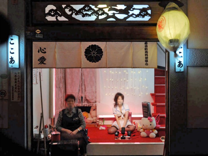 Cuando estuve en Osaka hicimos una visita por el barrio de Tobita, el barrio rojo. Era muy curioso ver todo lleno de entradas a "casas" en las que en casa entrada estaba una chica, vestida de formas muy curiosas (incluyendo con equipaciones de futbol del Barca y Madrid), junto a su madame: