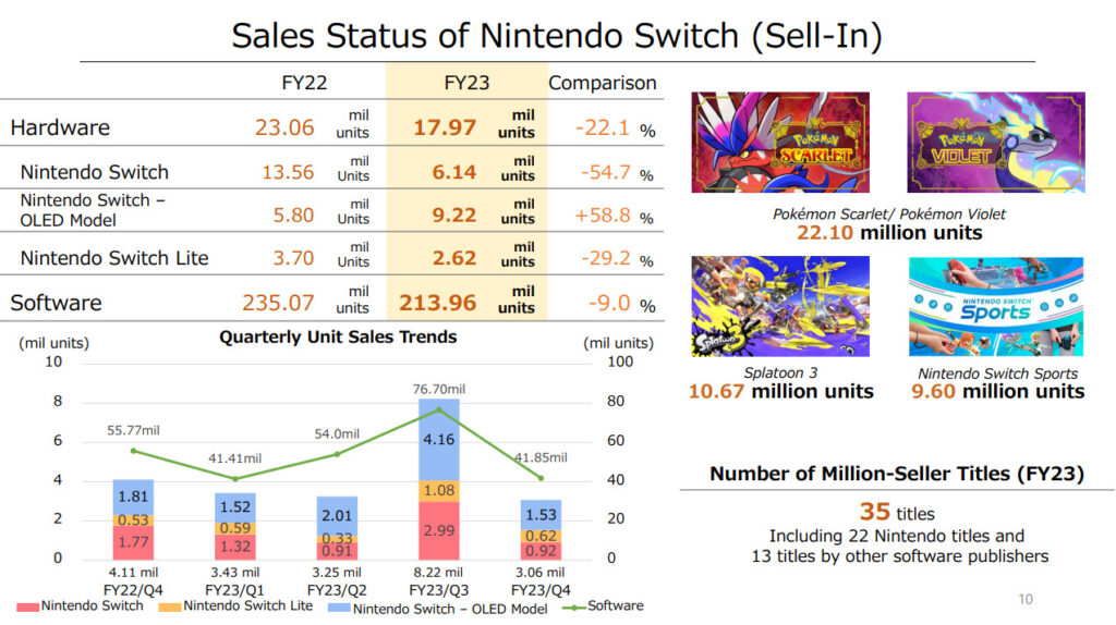 La desaceleración de las ventas de Switch se produce a pesar de dos lanzamientos de gran éxito durante el año fiscal: Splatoon 3 y Pokémon Scarlet % Violet, los cuales reportaron ventas combinadas de 32,77 millones.