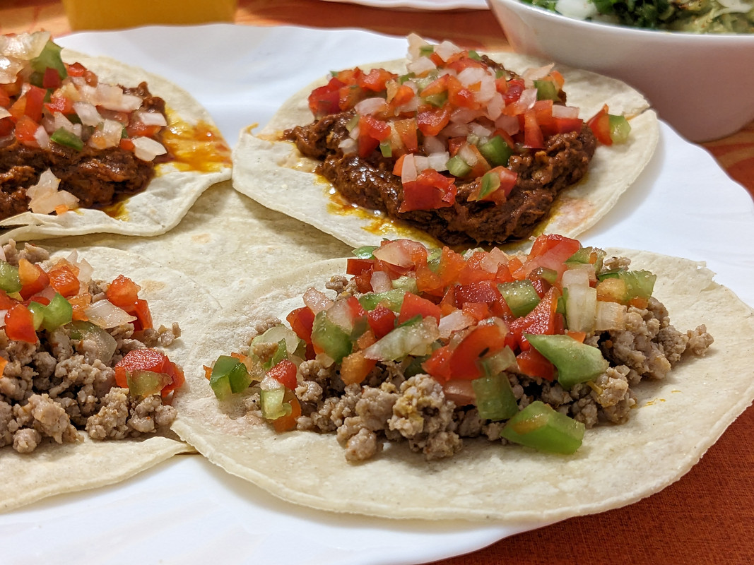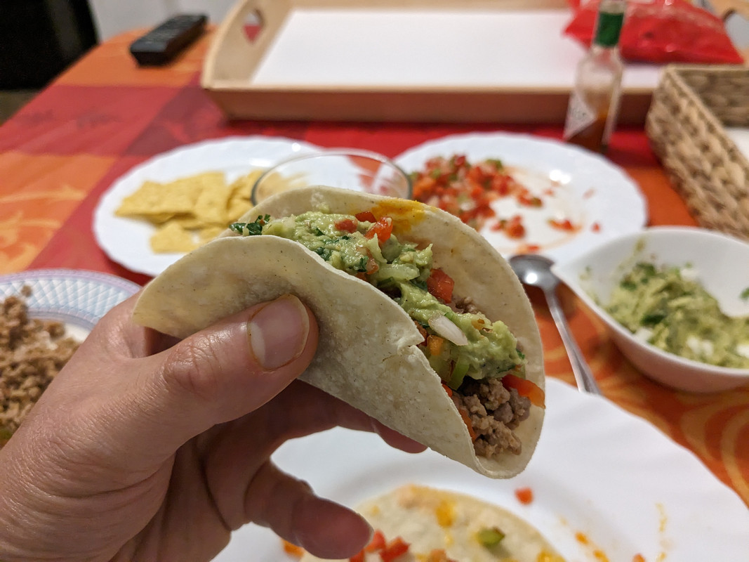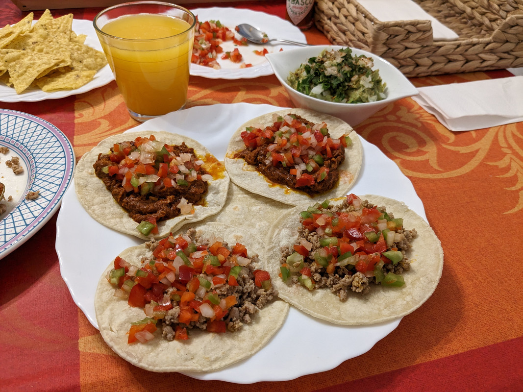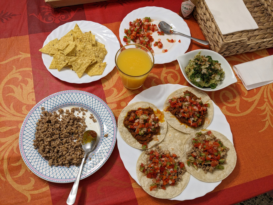 Hoy para cenar tocaba viaje a México, así que me he preparado unos tacos con cosas compradas en la sección de comida mexicana de Alcampo. Un preparado de cochinita pibil, tortillas de maíz, totopos de La Costeña, Tajín con limón, guacamole casero, carne picada con Tajín, pimiento y cebolla picada, Tabasco y agua fresca de naranja.