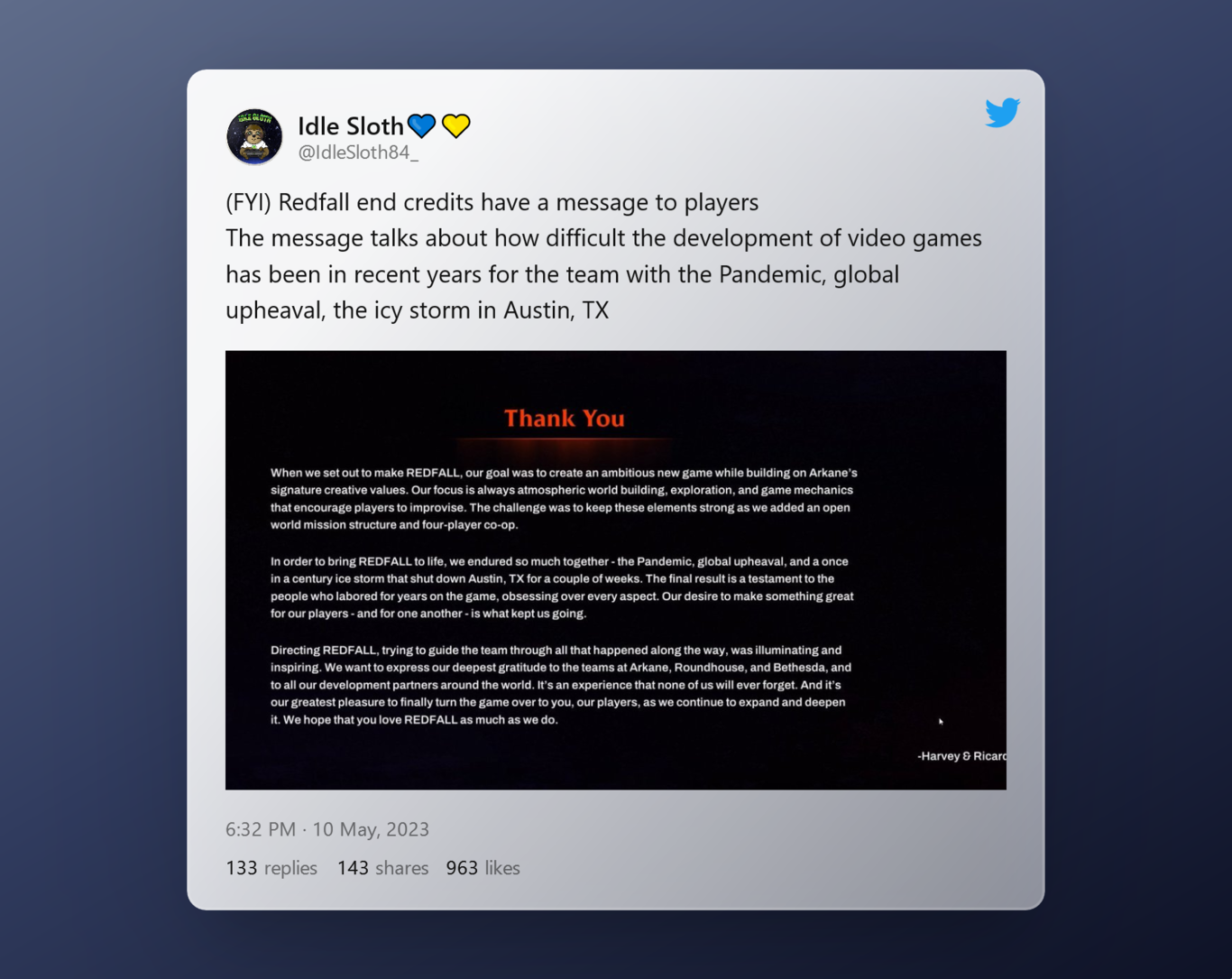 Tal y como puedes ver en el tuit de Idle Sloth situado más abajo en este mismo texto, Arkane ha introducido una carta final en los créditos de Redfall donde se agradece el apoyo de los usuarios y se enumeran algunas de las situaciones que ralentizaron el lanzamiento. Porque, aunque el equipo inició el proyecto con la ilusión de crear algo divertido para los usuarios, sus miembros no tardaron en sentir las consecuencias de eventos fuera de su control.