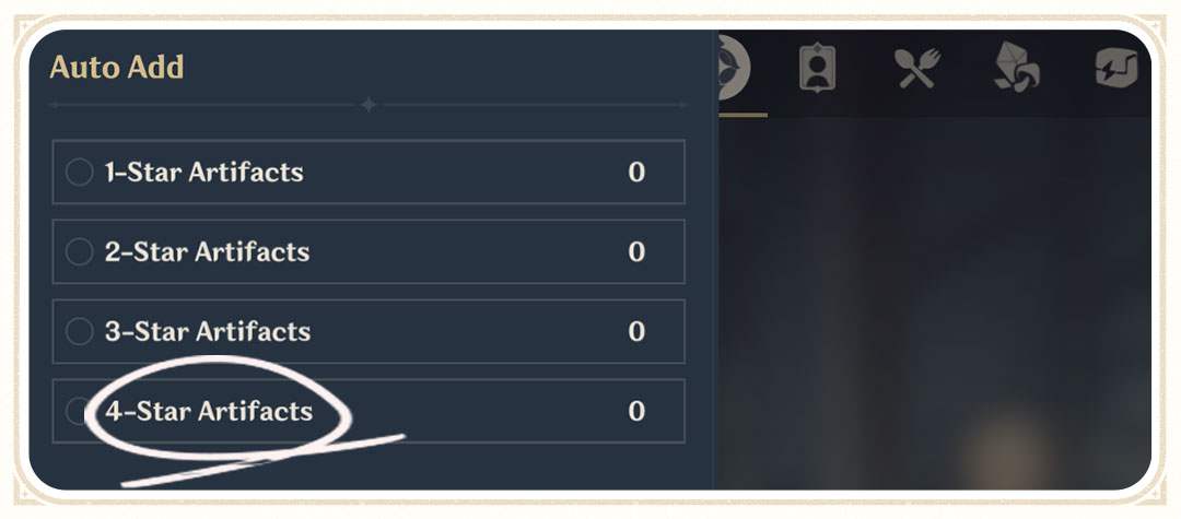 · Optimizaremos la función de destrucción de artefactos en el Inventario. Podrás añadir rápidamente artefactos de 4★.