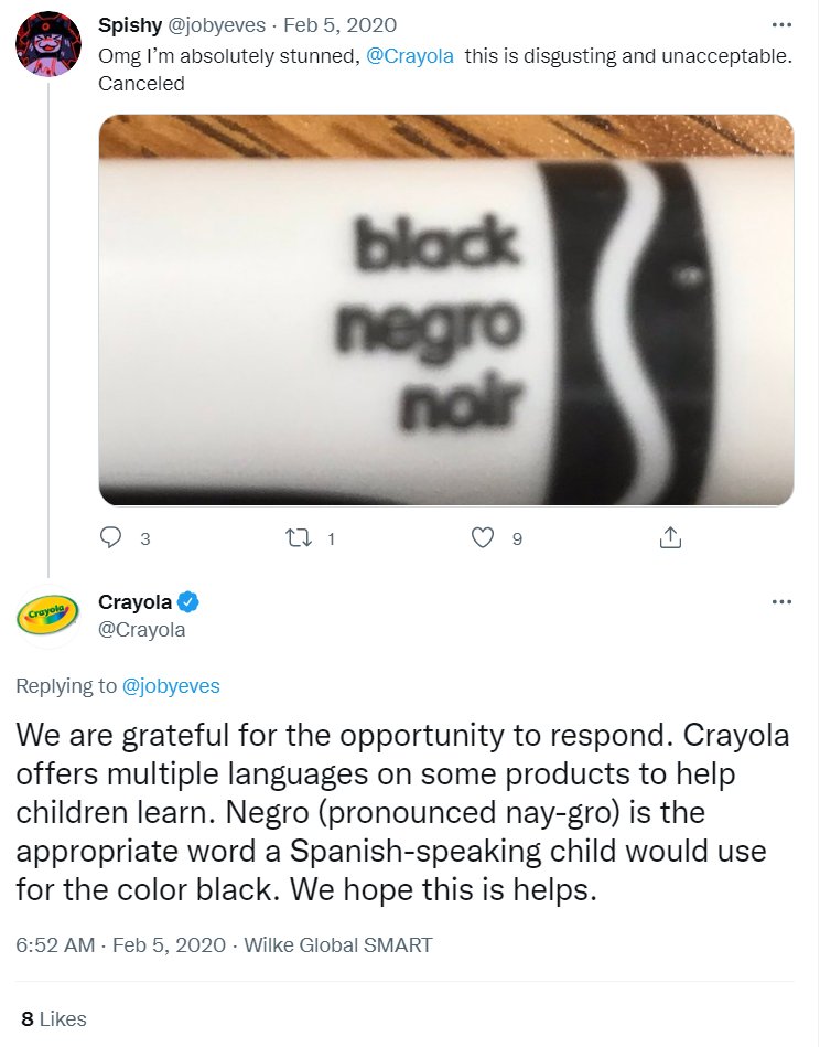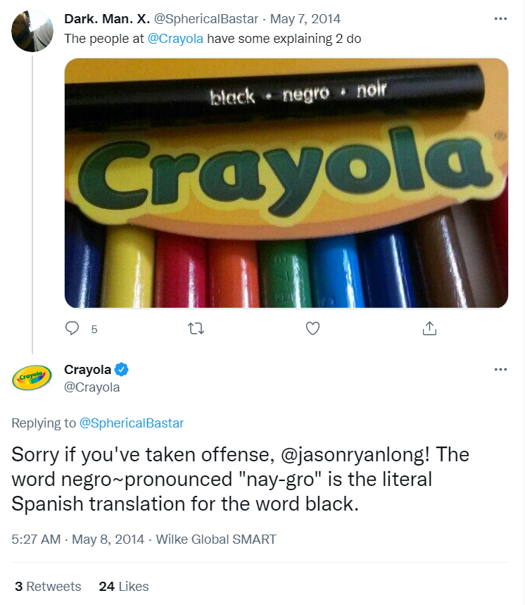 Me has hecho recordar a la polémica de Crayola, que ponían los nombres del color en sus lápices y ceras en inglés, español y francés, por ejemplo "red/rojo/rouge" o "blue/azul/bleu" o "green/verde/vert", y la que se lió cuando un usano descubrió que en la cera negra habían puesto "black/negro/noir", que cómo se les ocurría haber puesto algo tan racista como "negro", Twitter ese día lleno de mensajes así:
