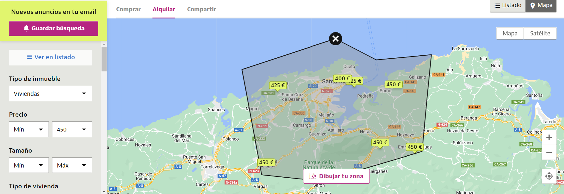 Mira, una búsqueda rápida incluyendo la ciudad de 9000 habitantes que te he dicho antes y pueblos de bastante menos a unos 20-25 minutos en coche de la capital de la CA (ciudad mediana). 511 viviendas libres, pero si aplico un filtro y pongo como tope 450 euros...